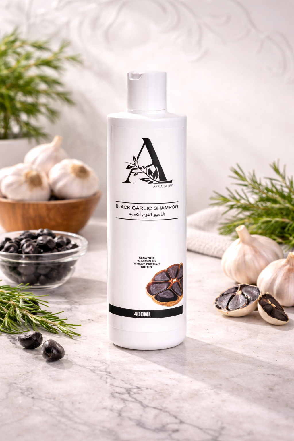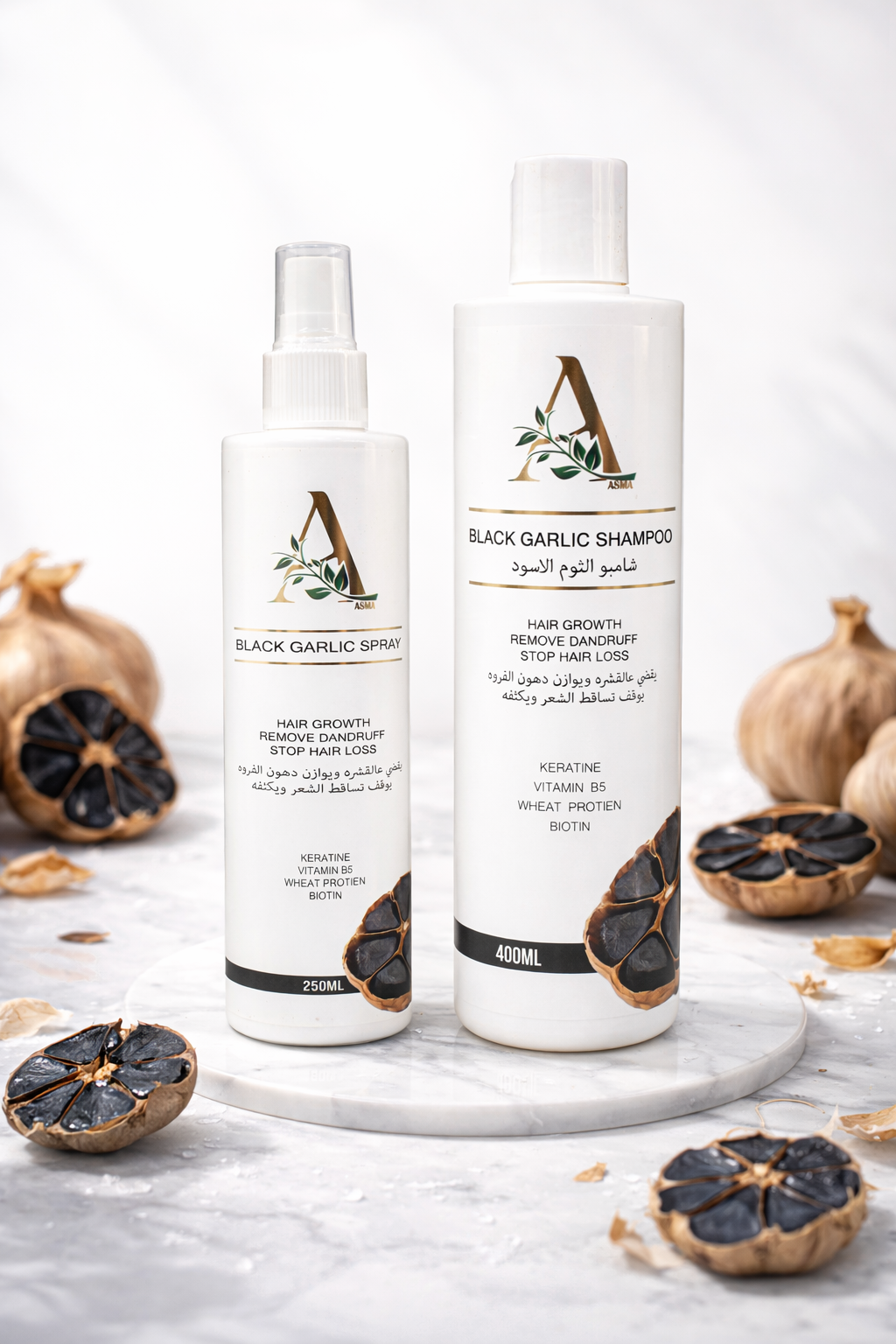 Our Black Garlic Spray and Shampoo are expertly crafted with the natural benefits of black garlic to provide comprehensive care for your hair and scalp. Rich in antioxidants and essential nutrients, this duo promotes hair growth, strengthens strands, and reduces breakage, leaving your hair visibly healthier and more resilient. The unique formulation also nourishes the scalp, helping to combat dryness and improve overall hair vitality, while imparting a natural shine and smoothness for a refreshed and revitalized look.بخاخ وشامبو الثوم الأسود لدينا مُصممان بعناية للاستفادة من الفوائد الطبيعية للثوم الأسود لتوفير عناية شاملة بالشعر وفروة الرأس. غني بمضادات الأكسدة والعناصر الغذائية الأساسية، يُعزز هذا الثنائي نمو الشعر، يقوي الخصلات، ويقلل من التقصف، مما يجعل الشعر أكثر صحة ومرونة بشكل واضح. كما تعمل تركيبته الفريدة على تغذية فروة الرأس، والمساعدة في مكافحة الجفاف، وتحسين حيوية الشعر بشكل عام، مع منح الشعر لمعانًا طبيعيًا وملمسًا ناعمًا لإطلالة منتعشة ومفعمة بالحيوية.